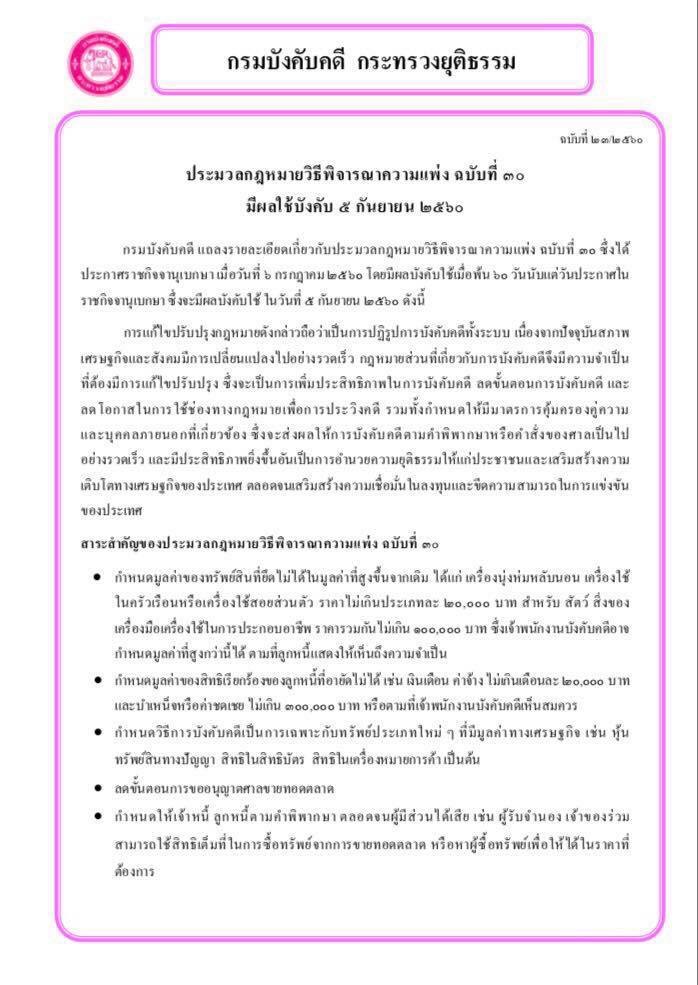 กรมบังคับคดี แถลงรายละเอียดเกี่ยวกับประมวลกฎหมายวิธีพิจารณาความแพ่ง ฉบับที่ ๓๐ ซึ่งได้ประกาศราชกิจจานุเบกษา เมื่อวันที่ ๖ กรกฎาคม ๒๕๖๐ โดยมีผลบังคับใช้เมื่อพ้น ๖๐ วันนับแต่วันประกาศในราชกิจจานุเบกษา ซึ่งจะมีผลบังคับใช้ ในวันที่ ๕ กันยายน ๒๕๖๐ ดังนี้