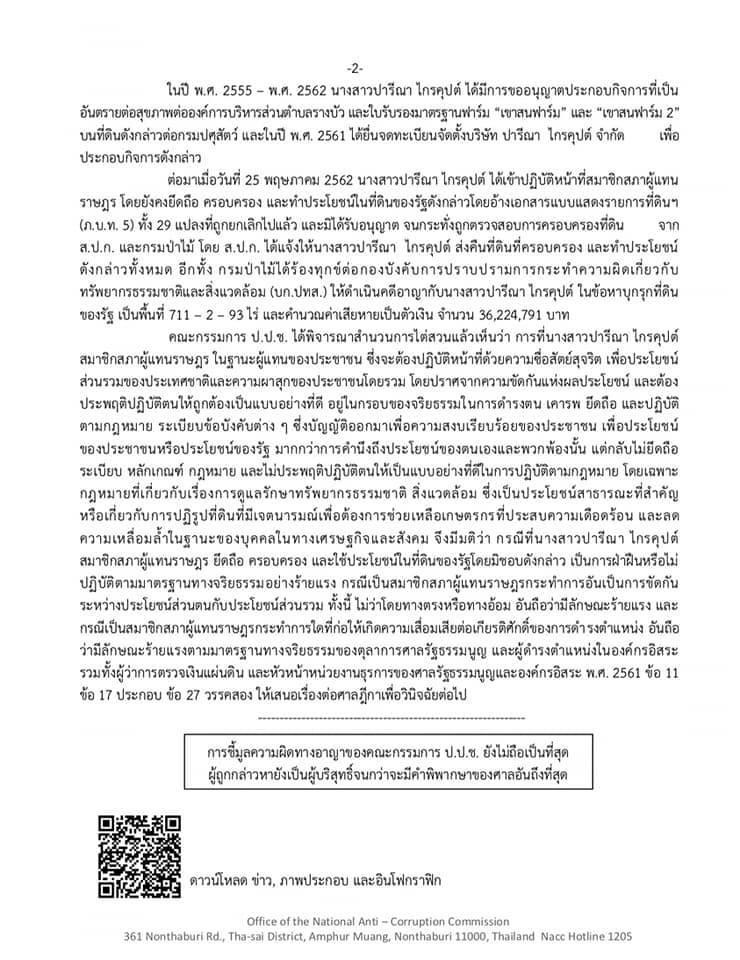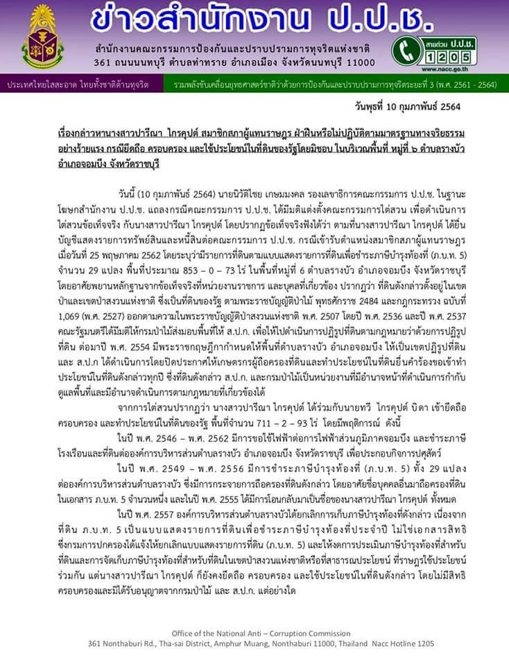 วันนี้10ก.พ 64 สำนักงานคณะกรรมการปราบปรามการทุจริตแห่งชาติ มีมติส่งเรื่องปารีณา ไกรคุปต์ ส.ส ราชบุรี เขต 3 บุกรุกป่าสงวนแห่งชาติ มีความผิดด้ายจริยธรรมอย่างร้ายแรงในฐานะผุ้ควรจะเป็นเยี่ยงอย่างที่ดีให้กับสังคม จึงลงมติส่งเรื่องให้ศาลฎีกาแผนกคดีอาญาของผู้ดำรงตำแหน่งทางการเมืองตัดสิน