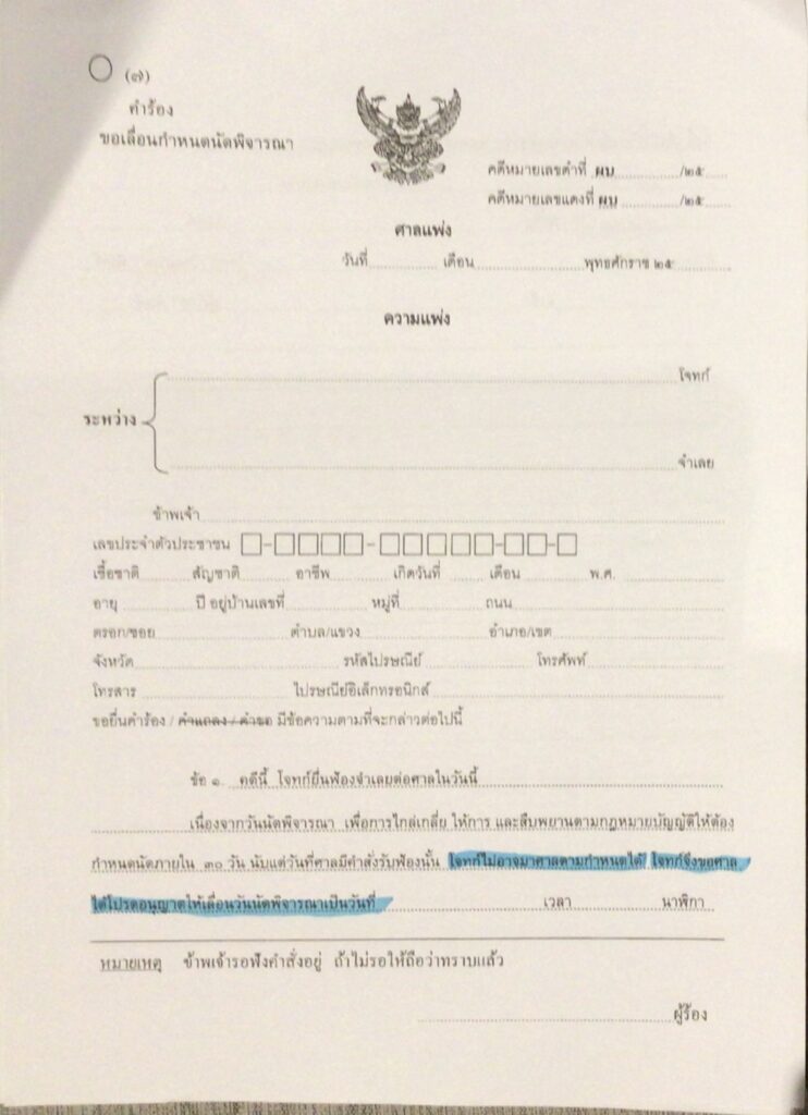 วีคลี่นิวส์ ได้รับเอกสารใบคำร้องขอเลื่อนนัดพิจารณา มีข้อความระบุว่า คดีนี้โจทก์ยื่นฟ้องจำเลยต่อศาลในวันนี้เนื่องจากวันนัดพิจารณาเพื่อการไกล่เกลี่ย ให้การ และสืบพยานตามกฎหมายบัญญัติให้ต้องกำหนดนัดภายใน30วันนับแต่วันที่ศาลมีคำสั่งรับฟ้องนั้น โจทก์ไม่อาจมาศาลตามกำหนดนัดได้ โจทก์จึงขอศาลได้โปรดอนุญาตให้เลื่อนวันนัดพิจารณาเป็นวันที่ …….
